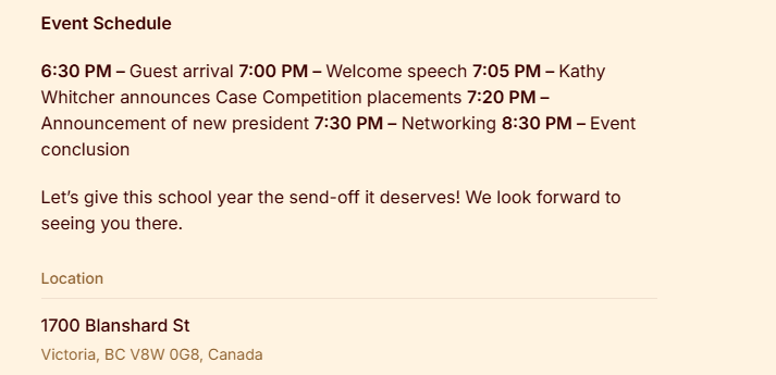 Here are 2 screenshots of last year’s (2024) UVicRec Spring Social program: held in the atrium building owned by UDI member Jawl Properties (Robert Jawl junior was a former president of the UDI) and was present at the event: