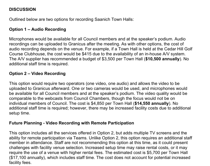 Even option 3, although they don’t call it that by name, instead: Future Planning – Video Recording with Remote Participation, with all the fixins added, are still below the original $6000-$8000 range. That said, one should ask why it would even be this high, given that a similar array of features for a 2 day town hall covering an estimated approximate 9 hours at a major event site on the Central Saanich Fairgrounds cost $8000+, and as in the case of option 2, doesn’t seem to take into account the possibility of incorporating the already available inhouse A/V system at the Cedar Hill Golf Course Clubhouse mentioned in Option 1.