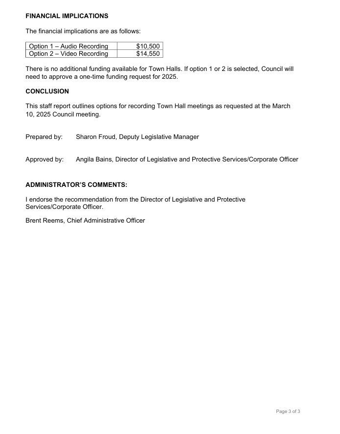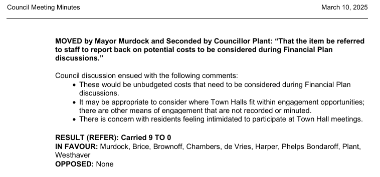 On March 10, 2025 Saanich’s Corporate Officer noted that staff research indicated the cost of a potential recorded town hall to be $6000-$8000 per meeting.