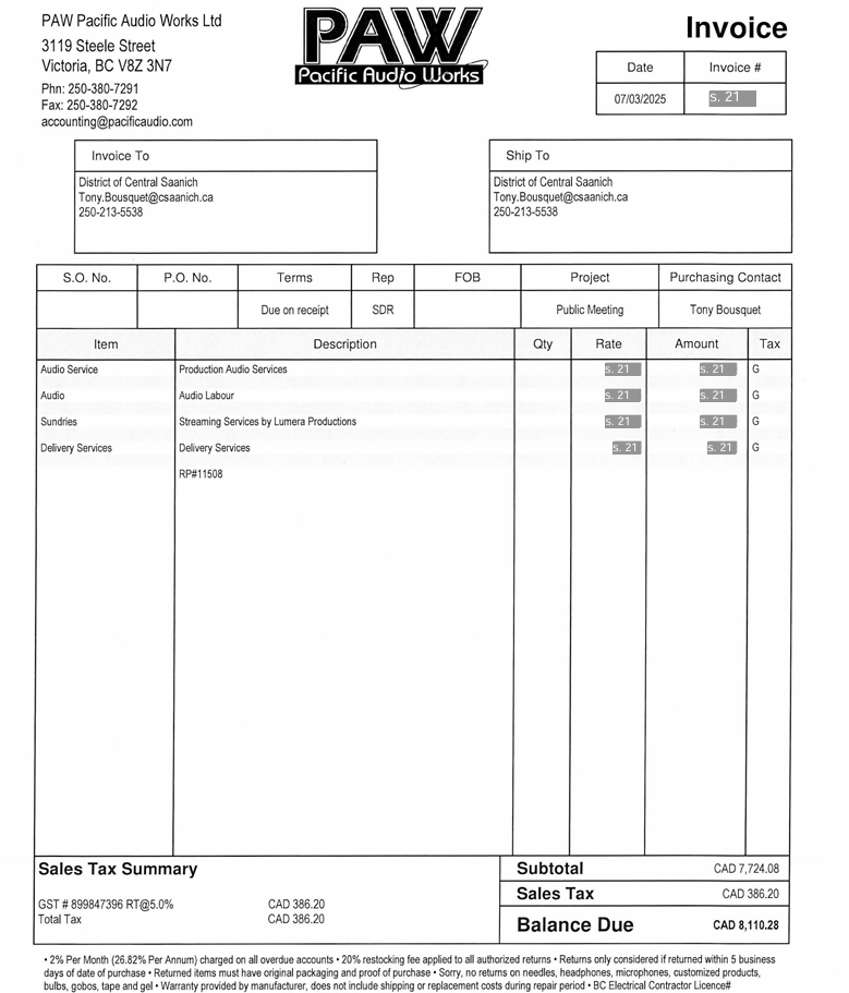 I received through the FOI an invoice from Pacific Audio Works for Central Saanich for $8,110.28 after tax that Saanich used to make its comparison.