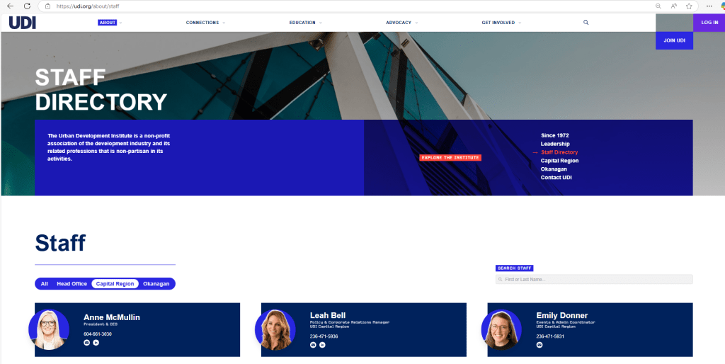 The only staff member missing from the UDI Capital Region’s staff listing on UDI.org is Kathy Whitcher, the Executive Director of the branch. Her name was also missing from the general list of UDI directors still accessible at the time of writing on UDI.org/leadership.