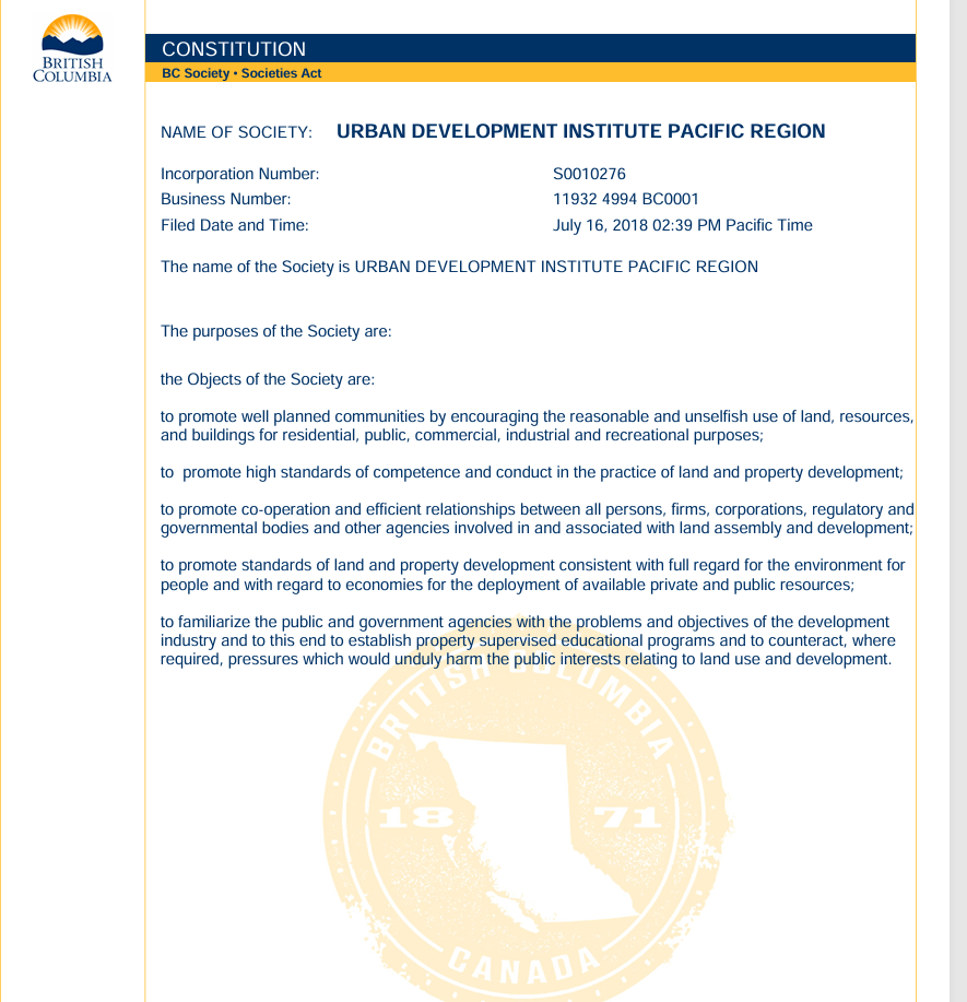 The Urban Development Institute (UDI) Pacific Region’s Constitution: A Society for “unselfish use of land”.