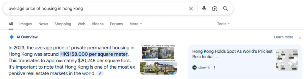 I made a quick Google search for “average price of housing in Hong Kong”.