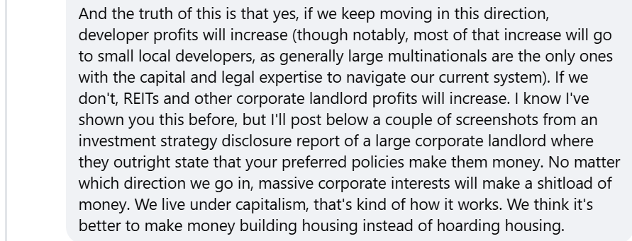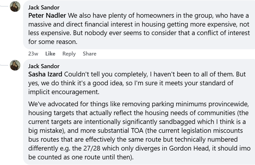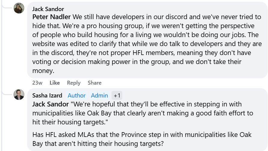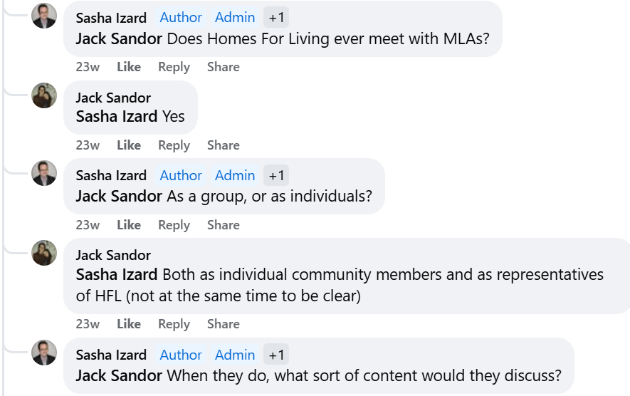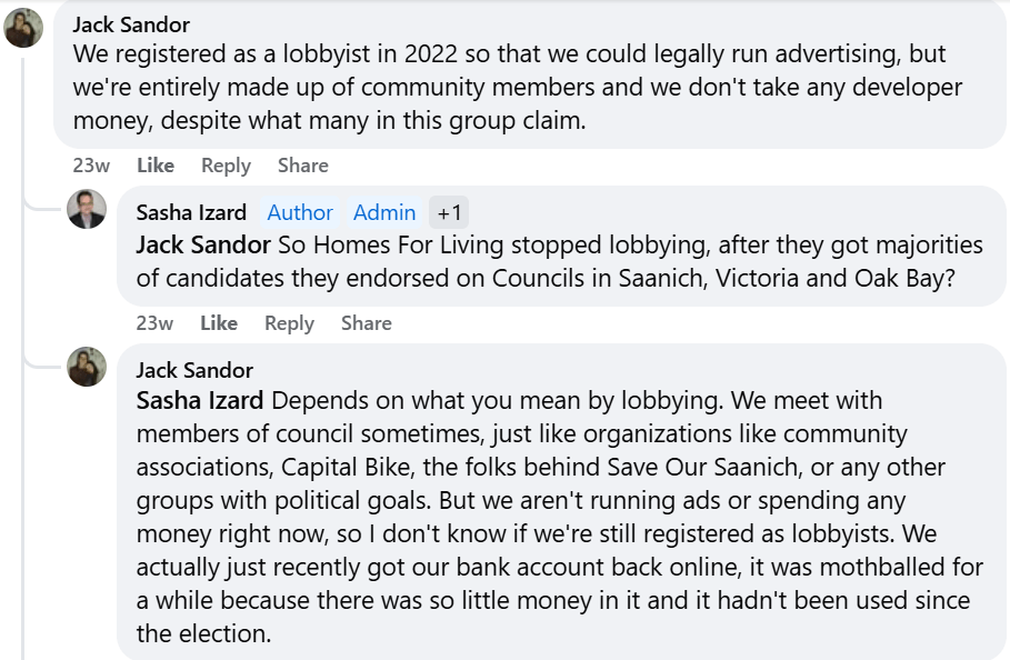 In the dialogue recorded in screenshots from the CRD Watch Facebook page, he discussed Homes For Living’s lobbying efforts including approaching MLAs to convince them to adopt various policies.