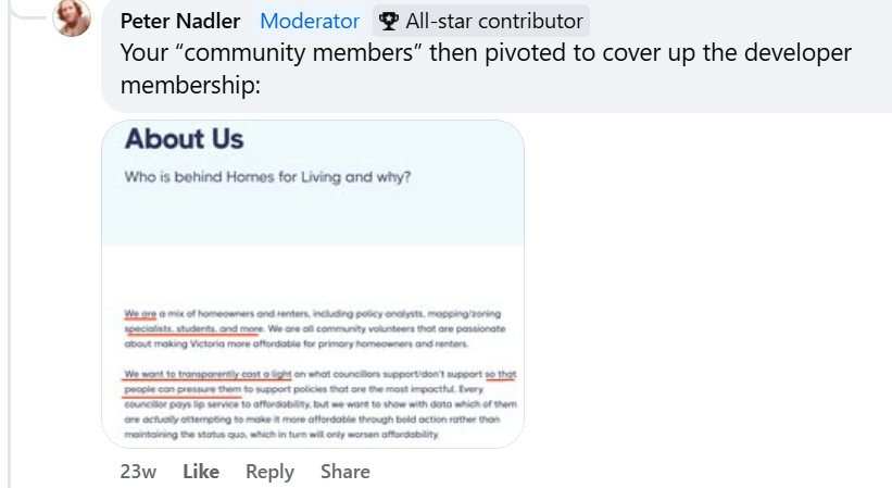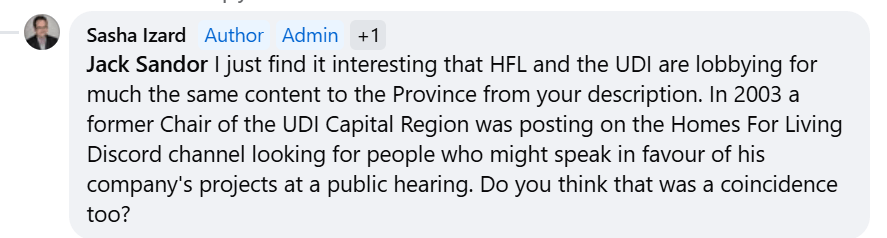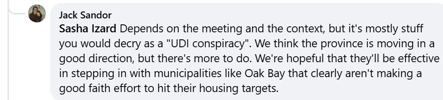 Note: The Chair of the UDI Capital Region, in early 2023, was screenshotted at various times appearing on Homes For Living’s online Discord channel looking for support for the rezoning proposals of the company he worked for. An address for his company’s office on Cook Street was provided on the BC Lobbyists Registry at the time.