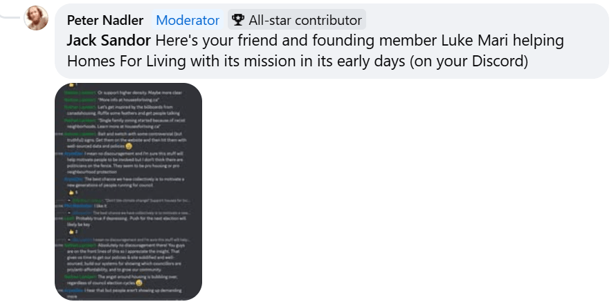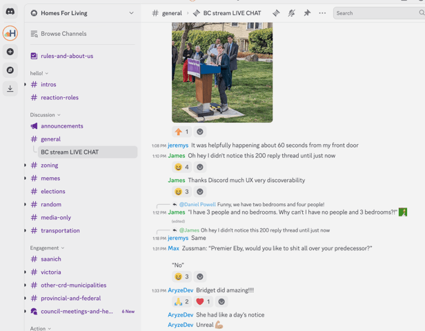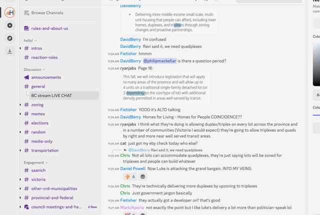 The following are Screenshots from Homes For Living’s online Discord Channel, including their discussion of the Province’s release of its Homes for People Plan: