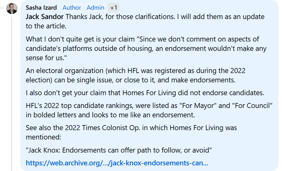 On July 14, 2025 a commentary was published in the Times Colonist by Jack Sandor described as vice-president of the non-profit Homes For Living.
