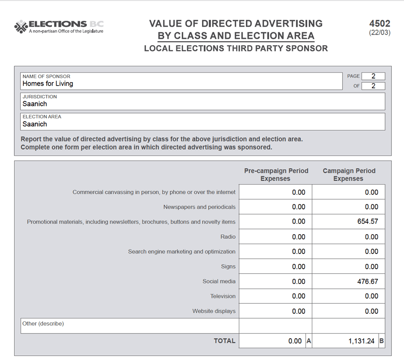 Additionally, section 62 of LECFA sets out the information that must be made publicly available in relation to registered third party sponsors. Information related to Homes for Living is included in the list of third party sponsors registered for the 2022 general local elections, available here: https://elections.bc.ca/docs/lecfa/Registered-Third-Party-Sponsors-LEGE-2022-10-15.pdf