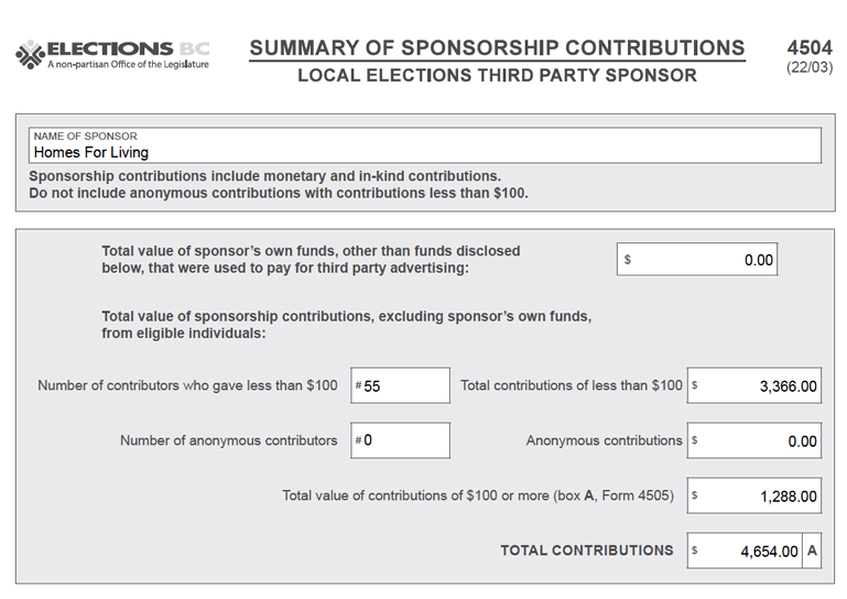 Over 93% of the donors to the 3rd Party Election Advertising Sponsor Homes For Living during the 2022 Local Government Election, donated anonymously. Serious questions need to be raised with the Province over the lack of transparency surrounding local government election campaign financing.