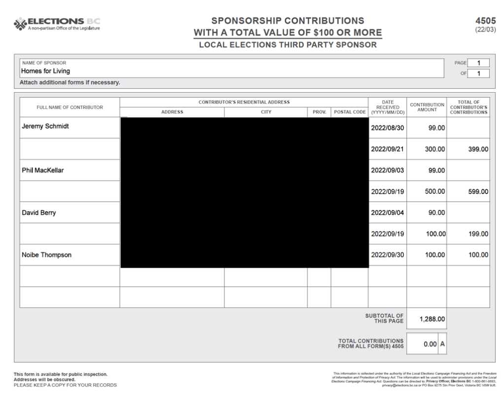 There were 59 campaign donors to Homes For Living in 2022. Only 4 of those donors are named on their Sponsorship Contributions form with Elections BC.