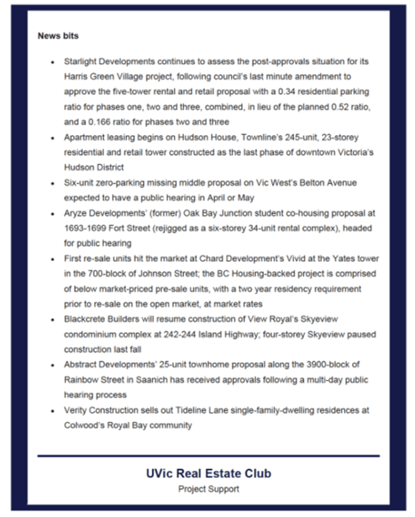The UDI’s advocacy towards the City of Victoria was mentioned in the UDI newsletter. It is also included under a list of the UDI’s “Advocacy Initiatives” in their 2022-2023 Annual Report. See below: