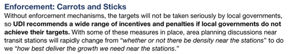The UDI has lobbied the province successfully to eliminate vast swathes of public hearings from local governments. They have successfully lobbied the province to adopt enforceable housing targets, and they have lobbied the province to adopt a carrot and stick approach in dealing with municipalities that do not conform to their agenda, which includes potentially cutting infrastructure funding to them, if they aren’t growing fast enough, in key areas well-served by transit, and by raising taxes on residents living in those areas:
