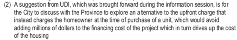 The following is quoted from the Province of BC’s Press Release this year, in regard to allowing developers to defer full payment of DCCs for several years: