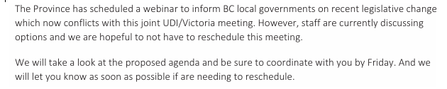As a recent FOI freedom the City of Victoria revealed the UDI and staff had a scheduling problem, when they were scheduled to meet, but the Province was going to announce recent legislative changes to local governments at that time. The Housing Legislation put forward in 2023, overrode municipal powers and the content in the legislation was based on much on what the UDI had been lobbying them to implement.