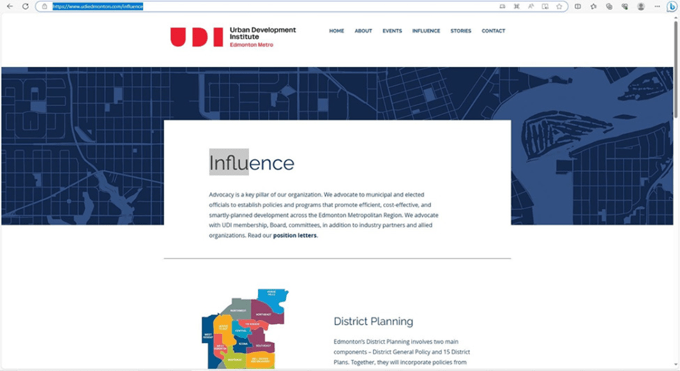 The UDI Edmonton Metro has also been incredibly explicit at their targeting of municipalities and their planning departments on their website. The following was a screenshot of http://www.udiedmontonmetro.com/influence taken within the last 2 years. That webpage was later taken down and replaced. I guess they realized that the reference to influence was too explicit. They later redirected to a new page called “Our Impact” Our Impact – Urban Development Institute Edmonton Metro. The Link to “Our Impact” on their front page can be seen in the 2nd screenshot below: