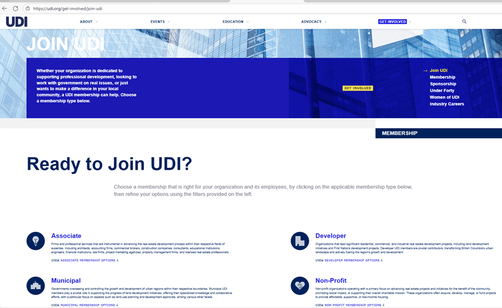 The following is screen captured from the UDI’s current website at the time of writing at the Join UDI | UDI – Urban Development Institute “Membership” page: