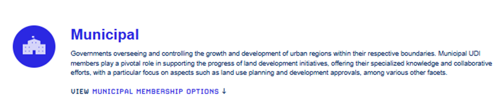 “Governments overseeing and controlling the growth and development of urban regions within their respective boundaries. Municipal UDI members play a pivotal role in supporting the progress of land development initiatives, offering their specialized knowledge and collaborative efforts with a particular focus on aspects such as land use planning and development approvals, among various other facets.”