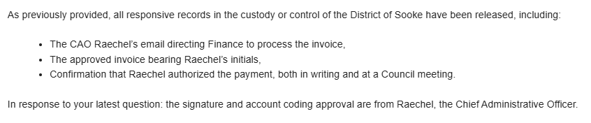 “As previously provided, all responsive records in the custody or control of the District of Sooke have been released, including: