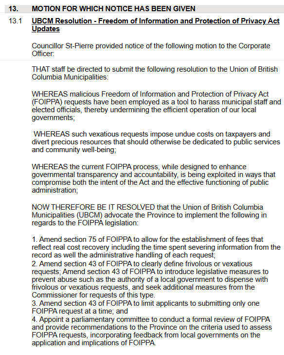 Appendix 2: Councillor St. Pierre’s Motion in regard to Section 43. of FOIPPA, which was to send a resolution to UBCM to place various limits on access to information.