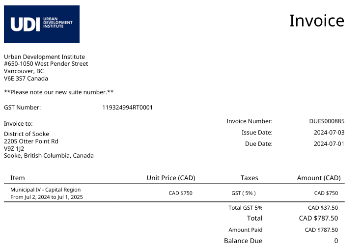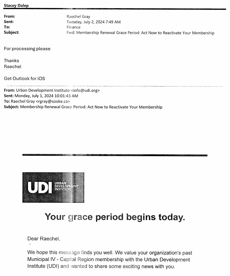 On July 1, 2024 the UDI contacted Sooke’s CAO, Raechel Gray informing her that it was time to renew the District’s UDI membership.