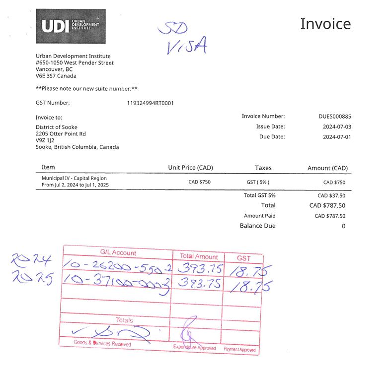 Please find the additional document attached. This record is a copy of the Urban Development Institute (UDI) invoice from July 2024, which contains account coding and an internal approval stamp used to process payment.