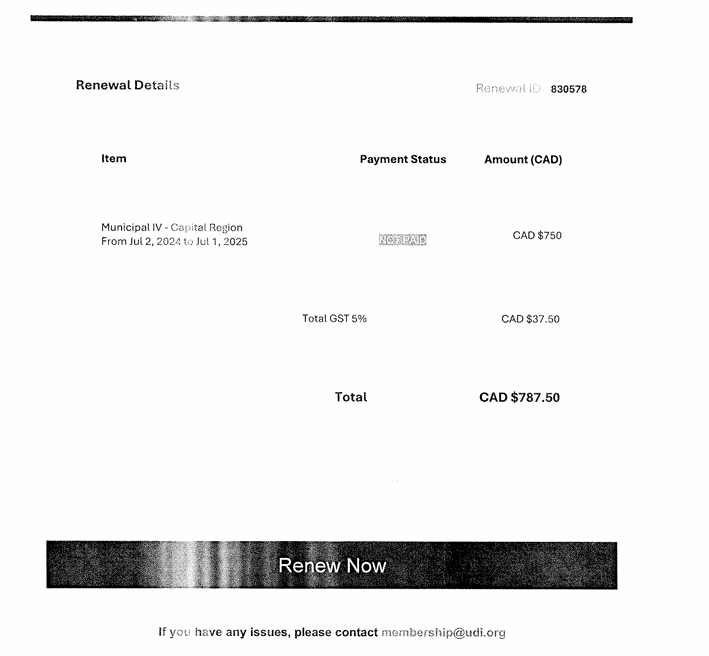 The previous annual membership invoice also included in the FOI, revealed that the timeline for the UDI membership renewal that staff had provided to the elected officials at the March 11, 2024 meeting had been incorrect. The staff claim at the meeting was that they had only recently renewed the membership, so the issue in their view was not time sensitive (thus council decided to give the UDI up to a year to respond). In actuality, the date on the invoice that had been provided to the District by the UDI for the membership, indicated the membership renewal period had been for July of 2023. Thus the membership was up for renewal in July of 2024. In the summer of 2024, District staff renewed the membership again, against the council motion that had been made several months earlier.