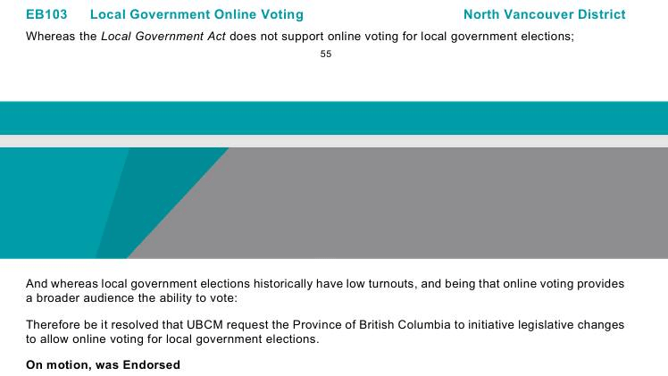 Above: an example in the 2024 ‘minutes’, of a UBCM resolution that was anonymously endorsed by elected officials (delegates) at UBCM. The majority of UBCM delegates voted in favour of this resolution to have online voting for local government elections, despite apparently, seldomly using their own electronic voting system at UBCM.