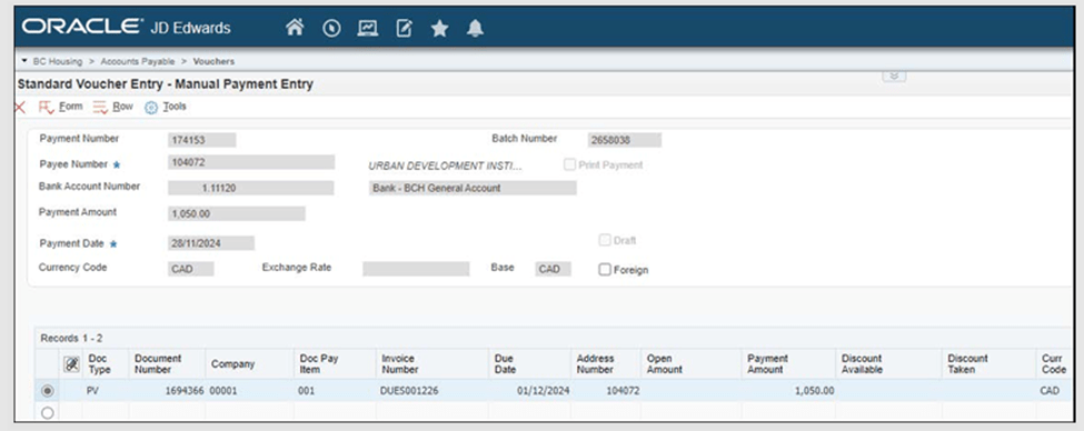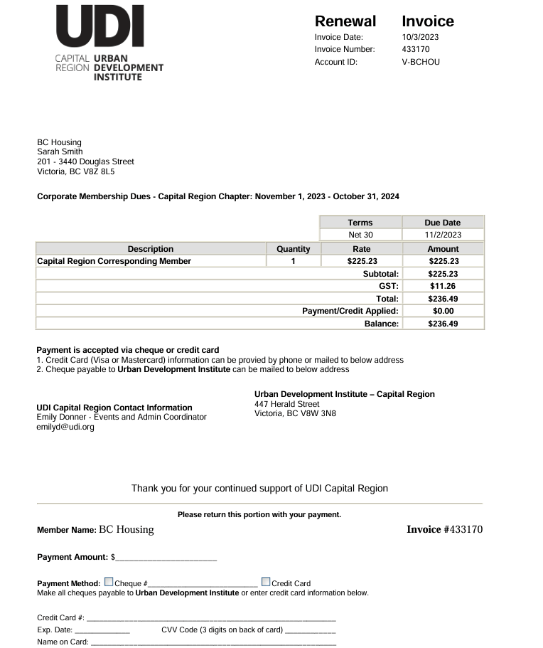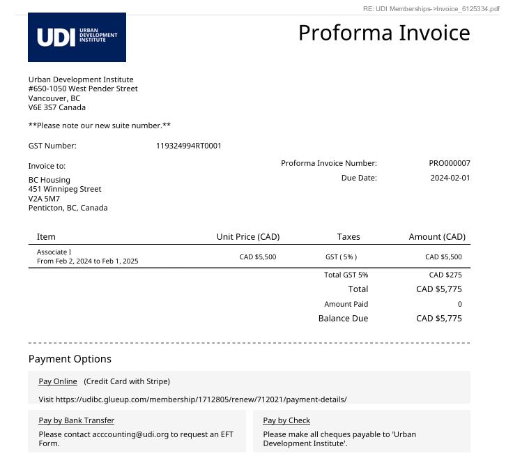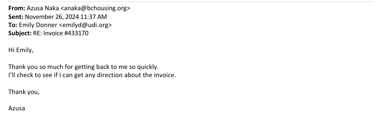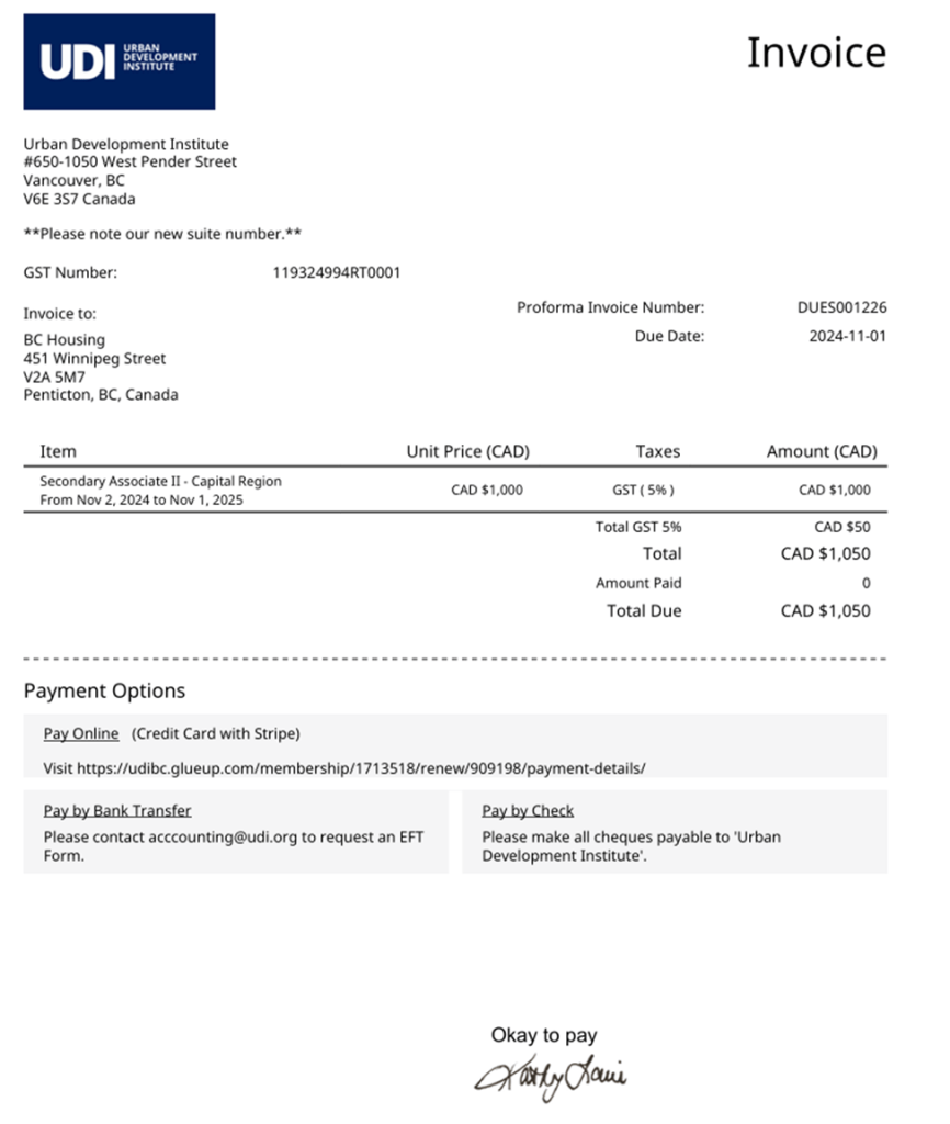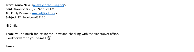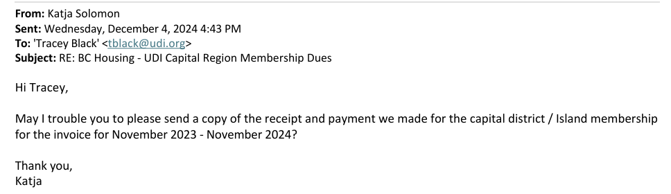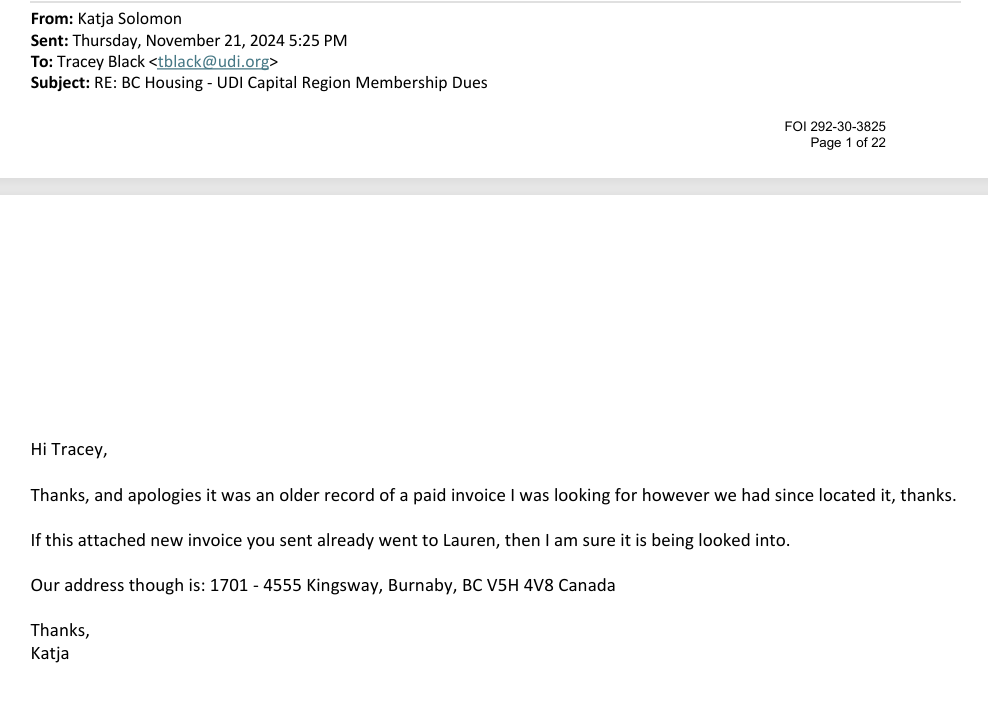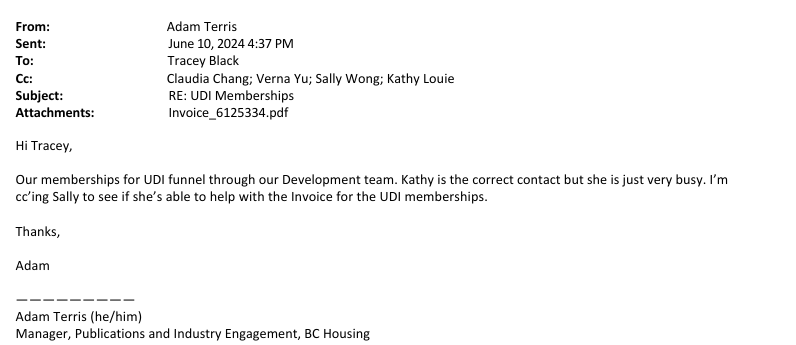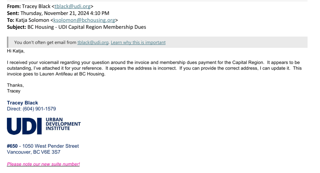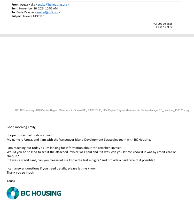 Later that year in November of 2024, the UDI sent an invoice to their Capital Region Director at their BC Housing email: