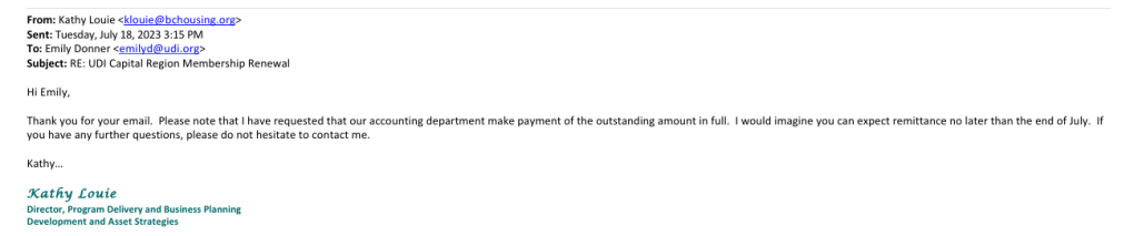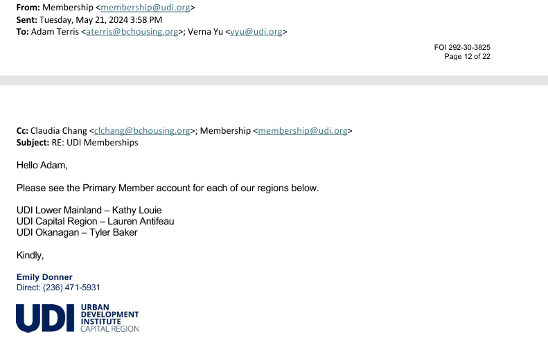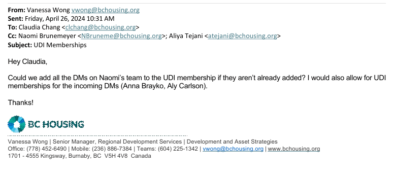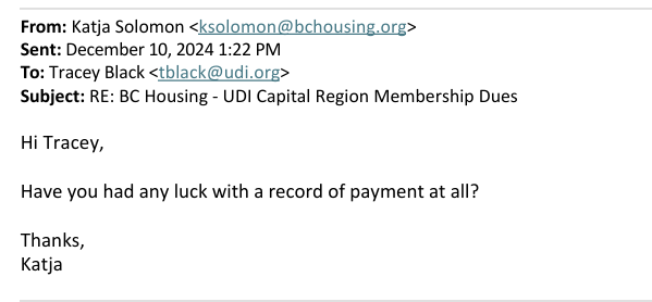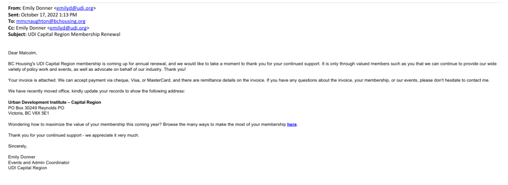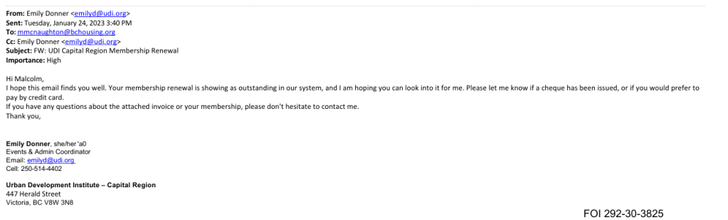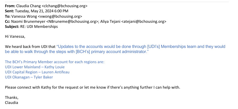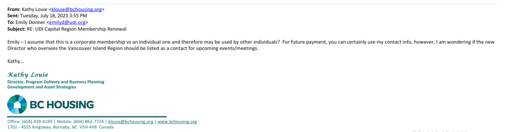 To sort out the issue of BC Housing’s payments to the UDI, the UDI Capital Region contacted their Director through their BC Housing email address: