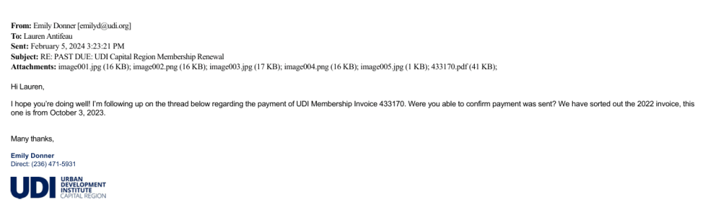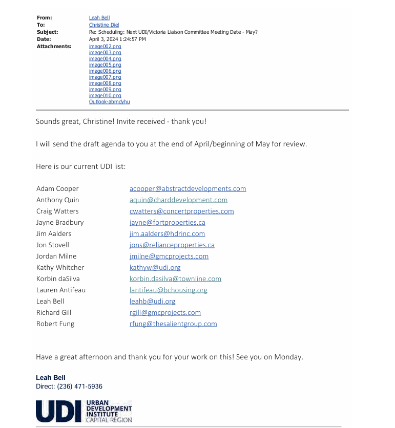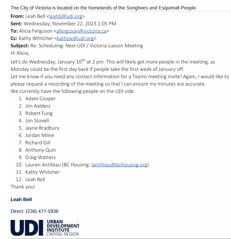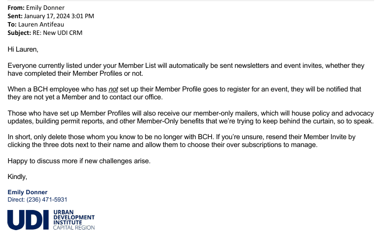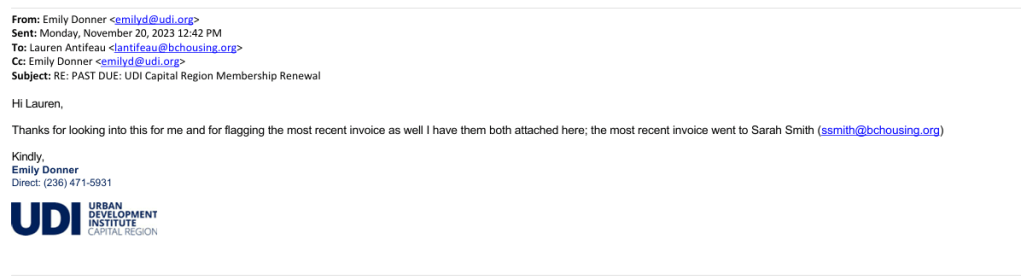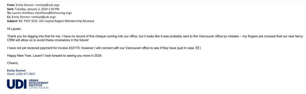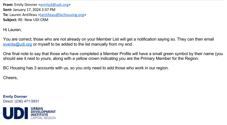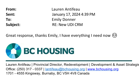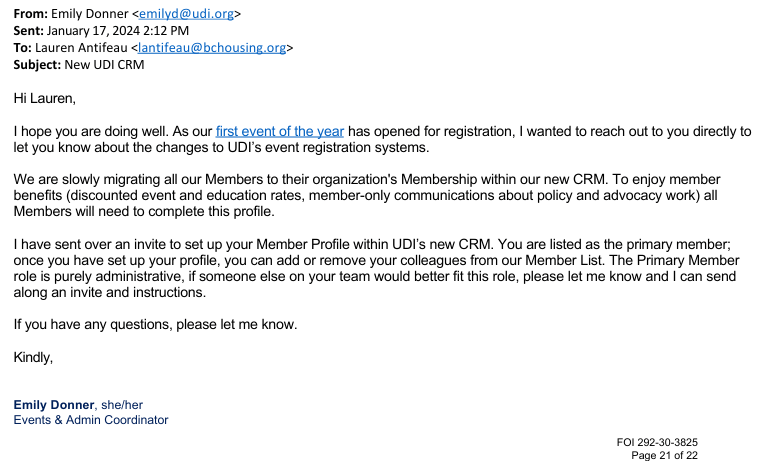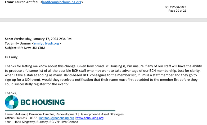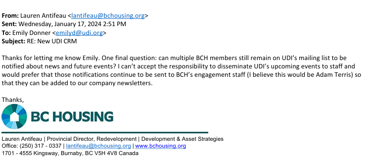 On Jan 17, 2024 the UDI’s Events & Admin Coordinator Emily Donner sent an email to UDI Capital Region Director Lauren Antifeau at her BC Housing email.