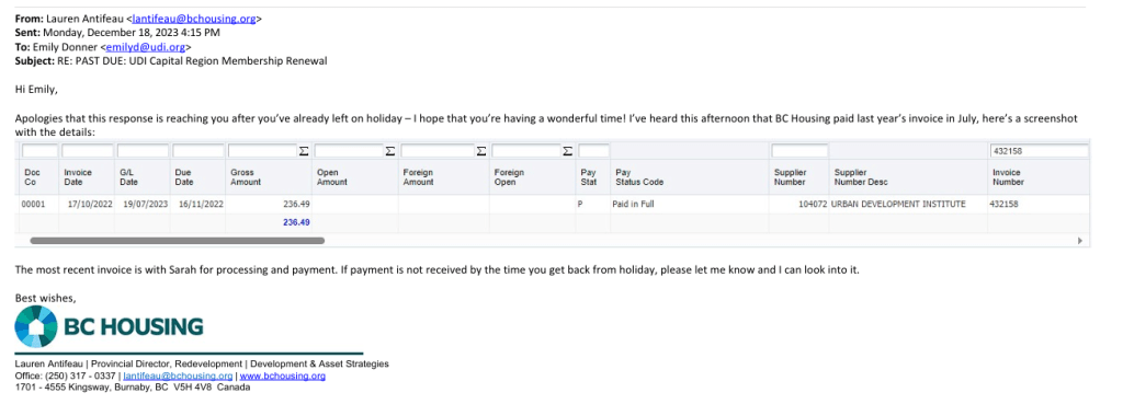 – UDI Capital Region Director Lauren Antifeau’s email through her BC Housing email address to the UDI Capital Region in regard to sorting out BC Housing’s various payments to the UDI.