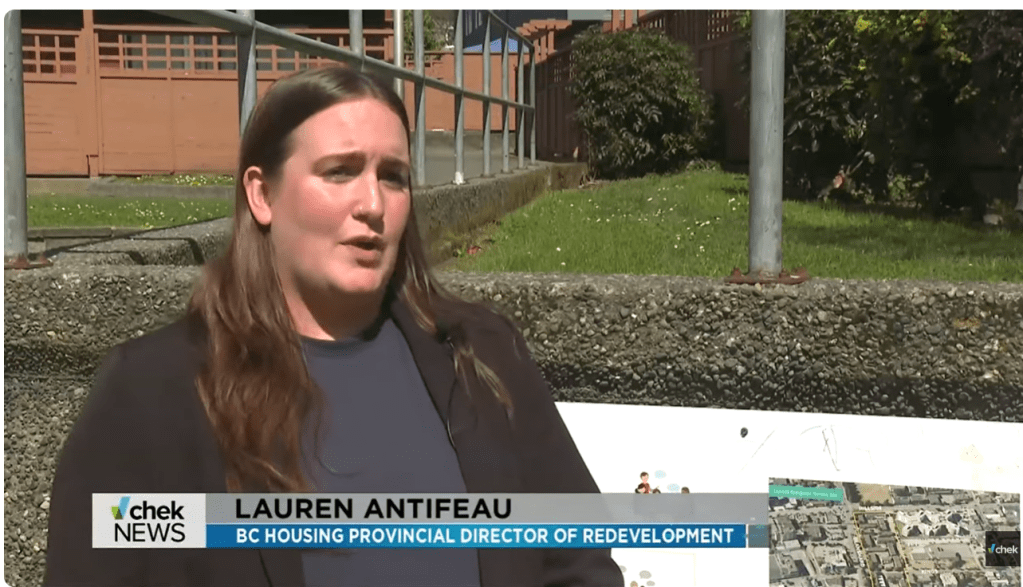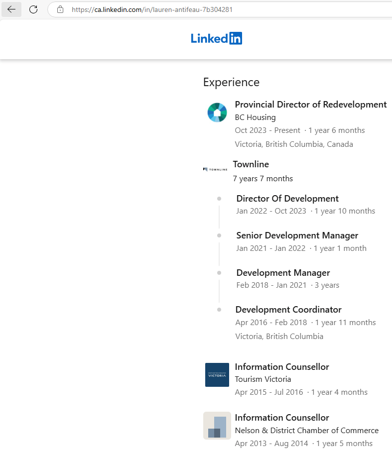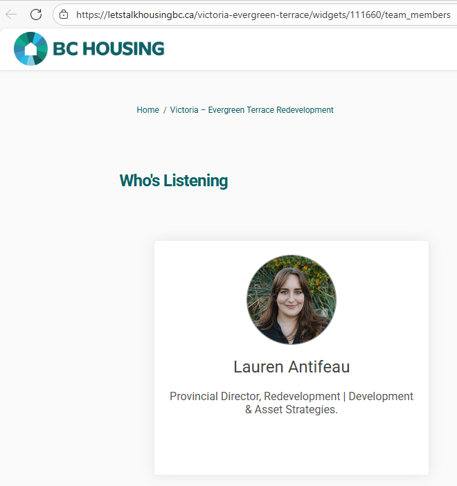 Note: it seems that BC Housing also has a Provincial Director of Redevelopment Sheryl Peters. It seems that Antifeau is the Provincial Director of Redevelopment on the island, while Peters is based on the mainland, but this is uncertain. BC Housing is lacking in transparency and does not seem to publicly post a staff directory.