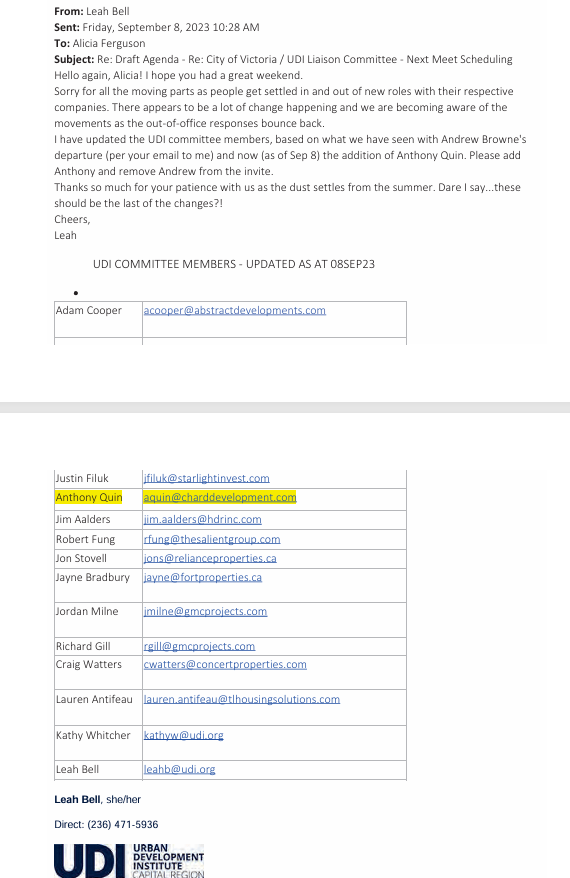 Yes, you read that correctly, UDI Capital Region Director Antifeau, with her position in BC Housing informed the UDI through her BC Housing email, that she would try adding as many BC Housing colleagues on the island as possible, to the member list of BC Housing’s UDI Capital Region membership, thus providing them BC Housing access to UDI events, (which could be paid for by BC Housing for them to attend those events).