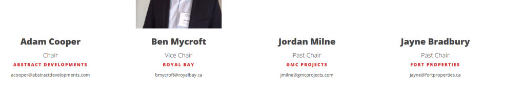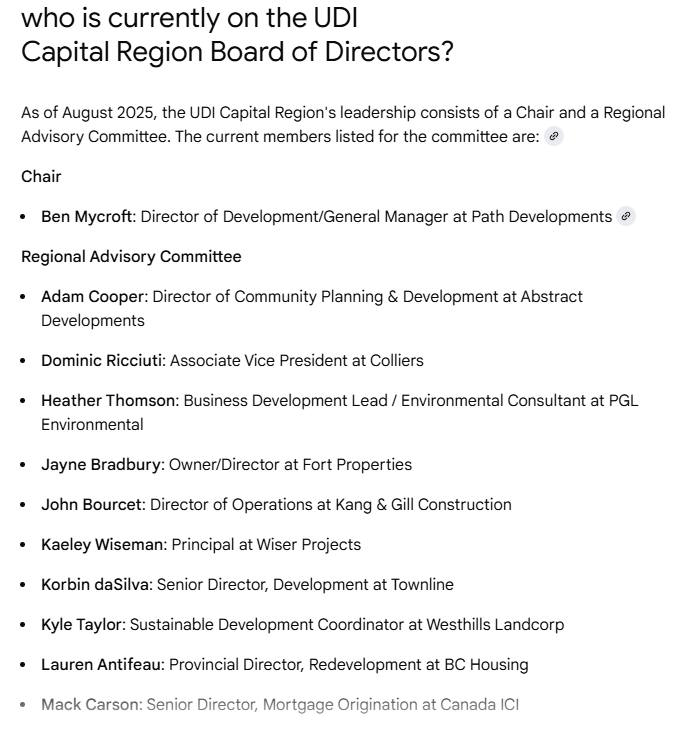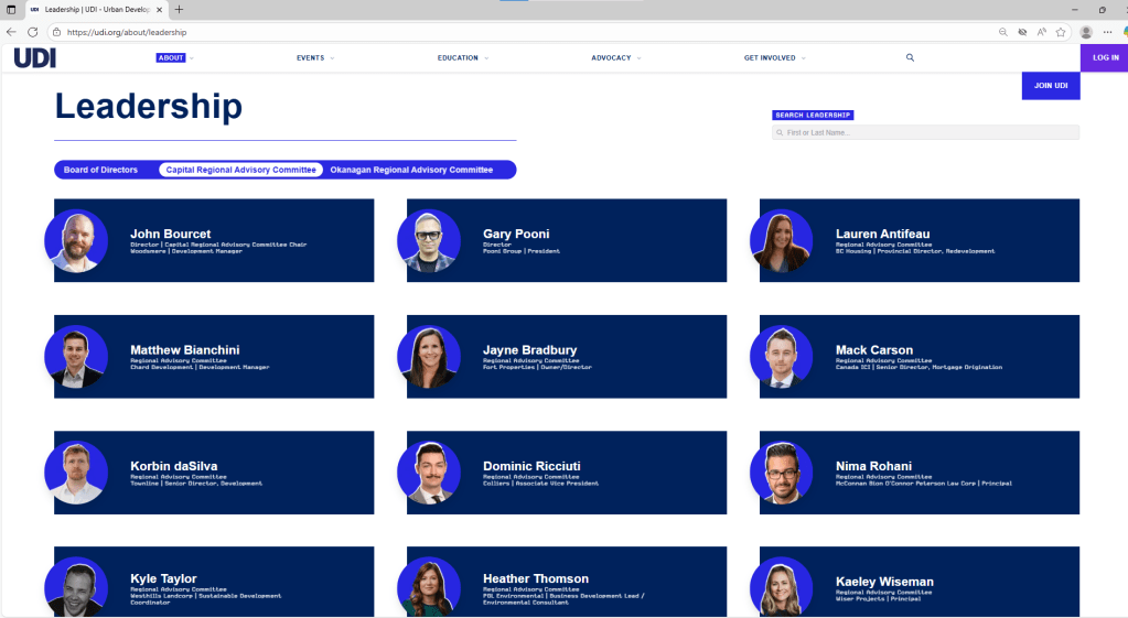 Antifeau and Carson (both UDI directors) are both on the board. Justin Filuk and Amanda Neal are former UDI directors. Former UDI Capital Region Executive Director Kathy Whitcher who left that position in 2025, also recently left her position on the UVic Real Estate Club Advisory Board. UDI Director Gary Pooni also left his position on the UVic Real Estate Club Advisory Board this year.