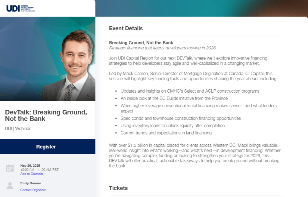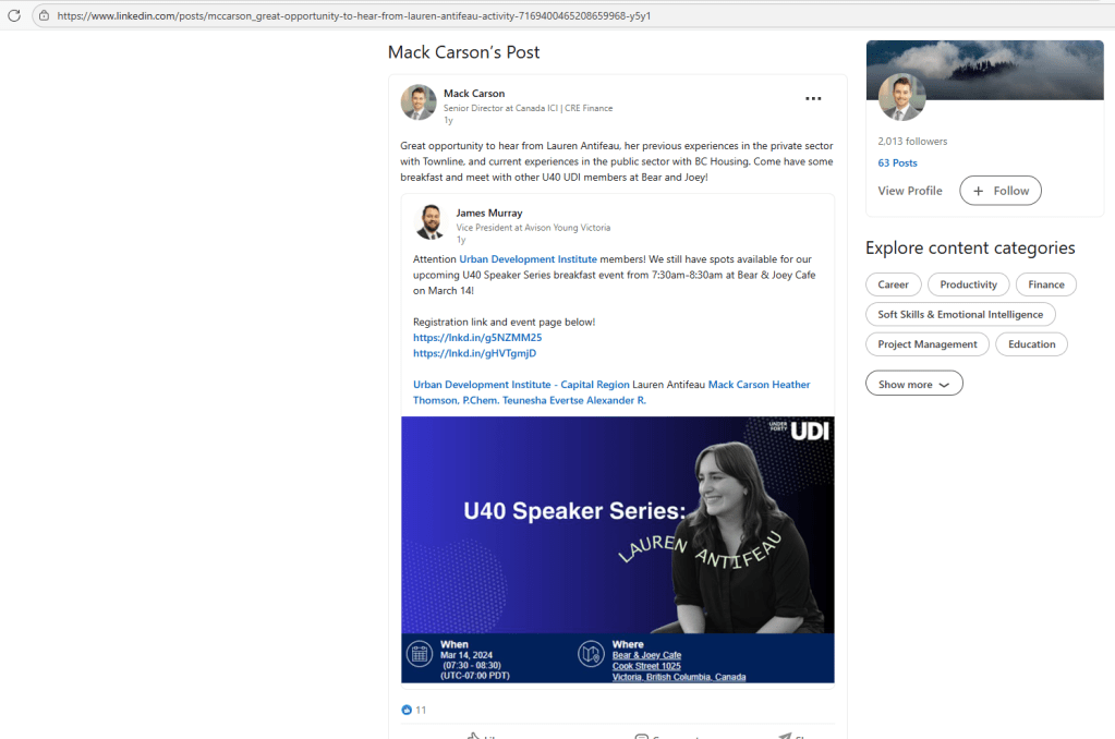 Oct 25, 2025 screenshot from LinkedIn post by fellow UDI Capital Region Director Mack Carson: Great opportunity to hear from Lauren Antifeau, her previous experiences in the private sector with Townline, and current experiences in the public sector with BC Housing. Come have some breakfast… | Mack Carson