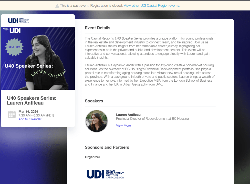 “Great opportunity to hear from Lauren Antifeau, her previous experiences in the private sector with Townline, and current experiences in the public sector with BC Housing. Come have some breakfast and meet with other U40 UDI members at Bear and Joey!”