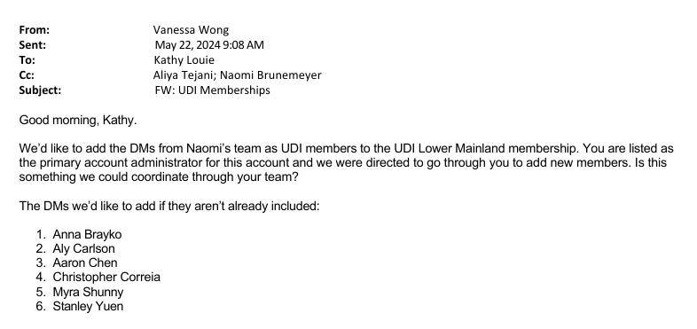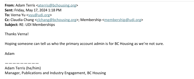 It seems there was confusion regarding a memberships with the UDI by a BC Housing employee that had left the organization.