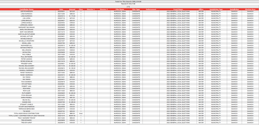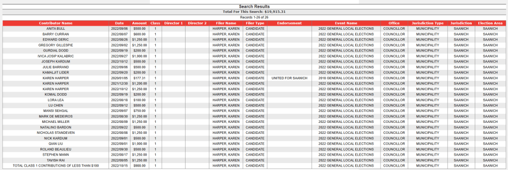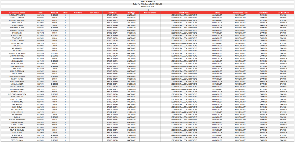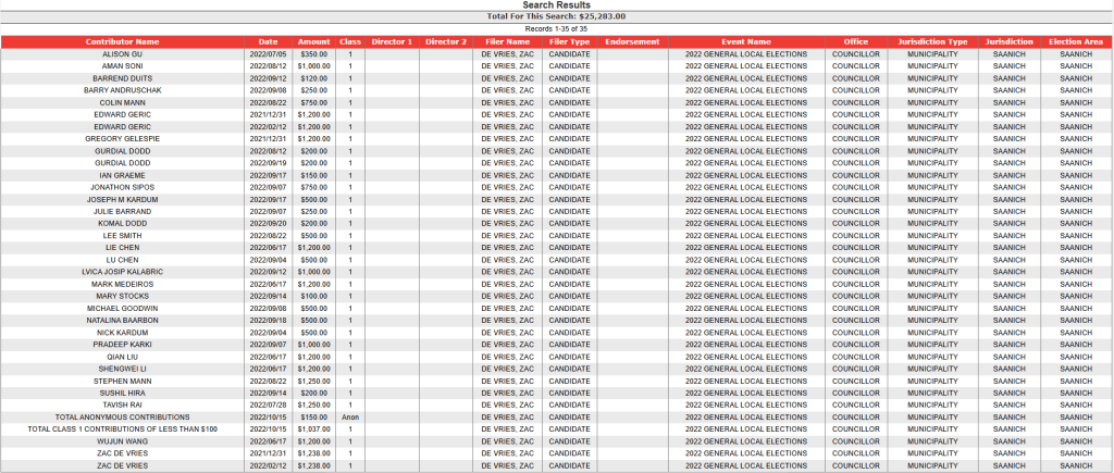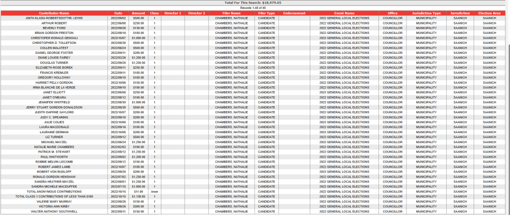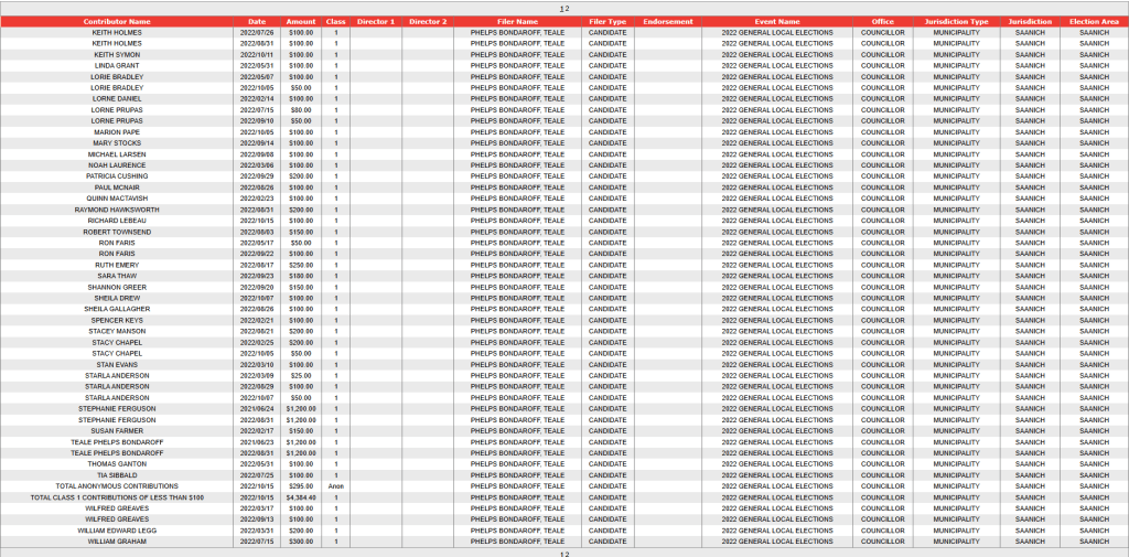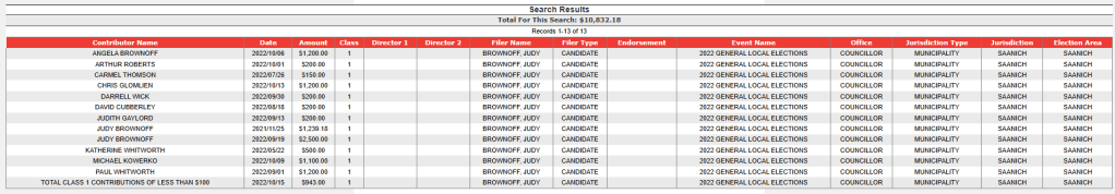 In this article is listed the campaign donations for those who were elected to Saanich Council in 2022, courtesy of information from Election BC’s website.