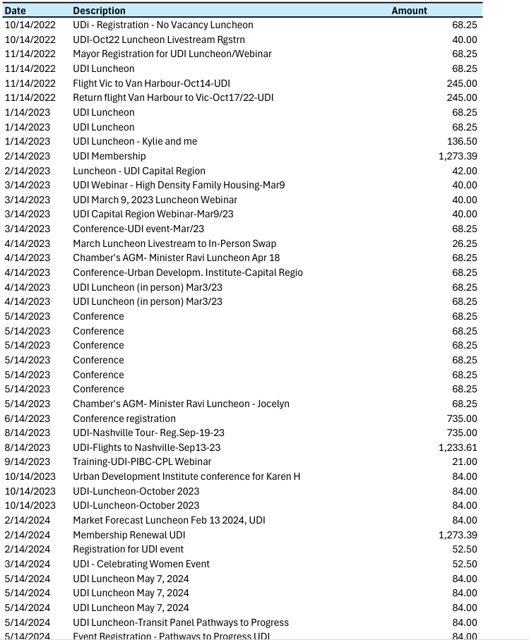 Today I received the FOI response from the City. Over the last 3 years, the City of Victoria paid over $12,000 on UDI related charges, including attending Urban Development Institute (UDI) events, a figure that is much higher than the figures bandied about in the discussion focussed solely on UDI membership costs, that took place in September. The UDI is a development lobby for corporate development and real estate interests, actively registered on the BC Lobbyists Registry.