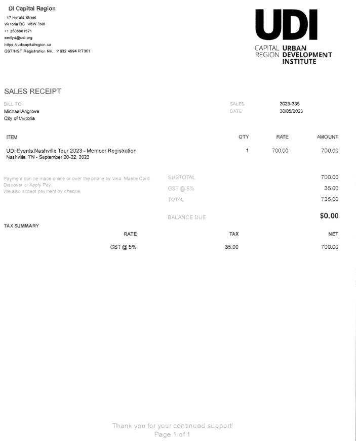 Records of all costs spent on Urban Development Institute (UDI) events, meetings with the UDI, money paid or reimbursed to staff or elected officials to attend UDI events, and all other costs paid to the UDI by the City of Victoria. For clarity, this search is only relevant to money the City of Victoria has paid in regard to the UDI and in regard to meeting with it.