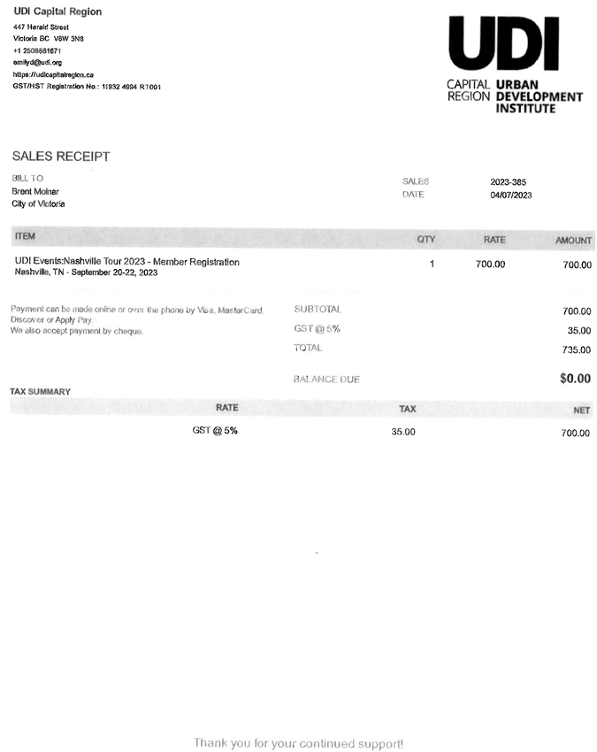 This was the cost ($735.00) to the City of Victoria for the employee, Brent Molnar to attend the event itself: