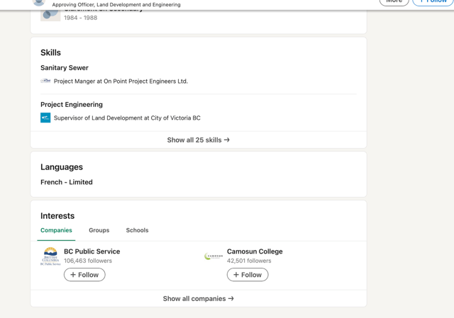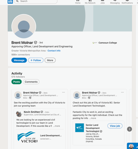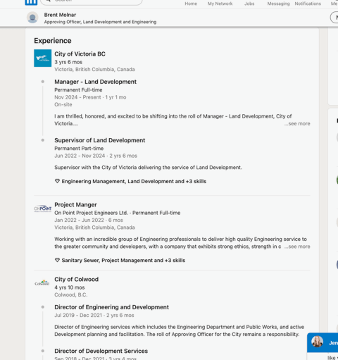 Molnar’s LinkedIn profile at the time of writing describes him as “Approving Officer, Land Development and Engineering” and currently “Manager – Land Development” for the City of Victoria. At the time of the event, he was “Supervisor of Land Development” for the City. He previously, worked in the City of Langford, and the City of Colwood in similar positions.