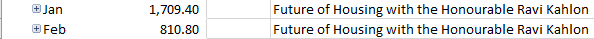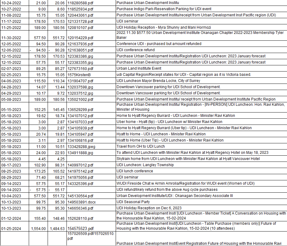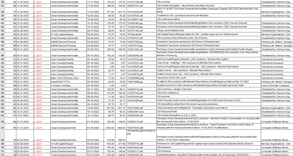 A corporate table for 10 at a UDI Luncheon with Ravi Kahlon Minister of Housing, cost BC Housing (the taxpayer), according to an entry $1,522.50 The end price in the Excel document entry for January shows even higher at $1,709.40, and then there’s an additional $810.80 for the same event entered a week later. Given that the UDI charges $300 for elected officials to be in attendance. Kahlon’s presence may have brought the total price to the taxpayer for just that one table to over $2000.