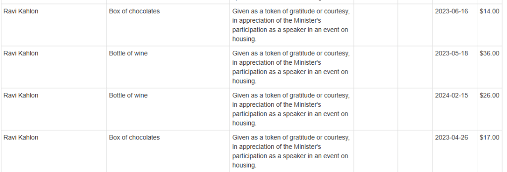 The following gifts were provided by the UDI to Kahlon when he was the Housing Minister, according to the BC Lobbyists Registry: