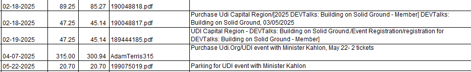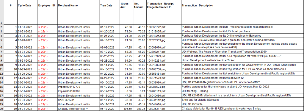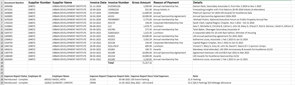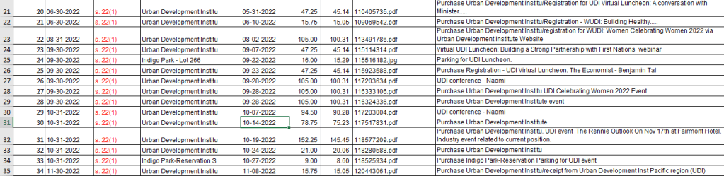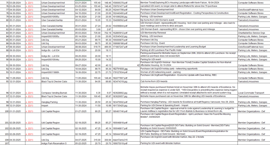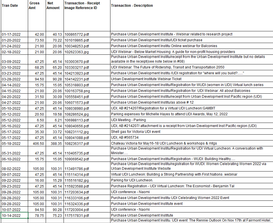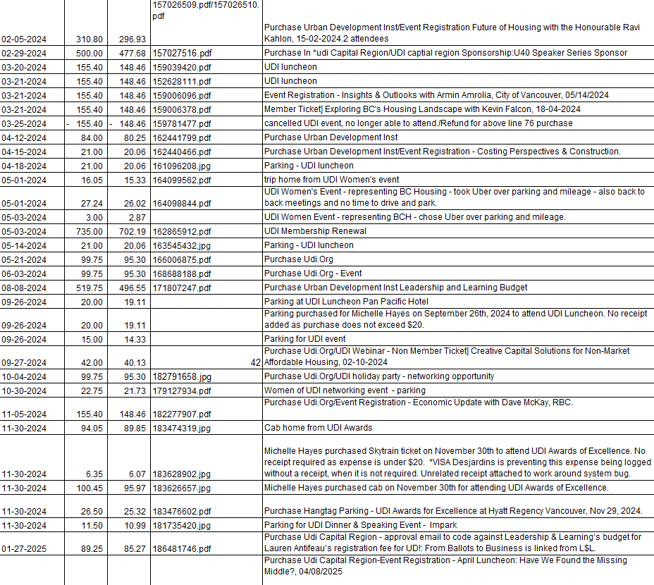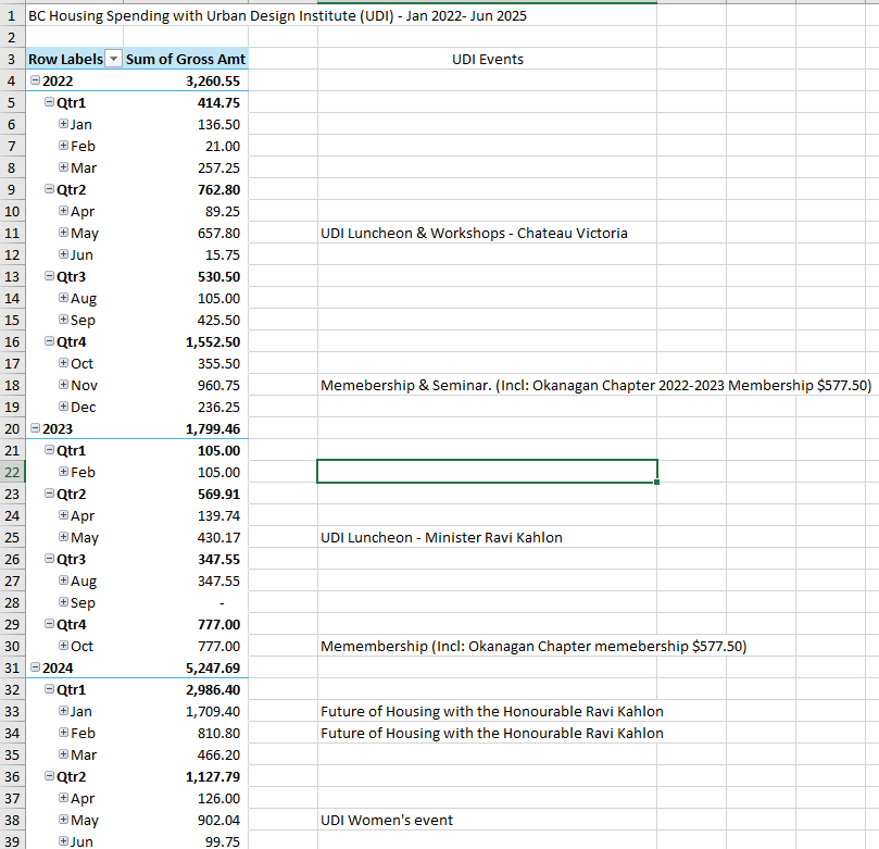 The following chart is from the Pcard (Personal Corporate Credit Card used by BC Housing Employees) Analyses of BC Housing’s spending on the UDI by month (Note the name Urban Design Institute is incorrect, it is the Urban Development Institute). The total came to $10,916.40 from Jan 22, June 2025 (just 3 and a half years):