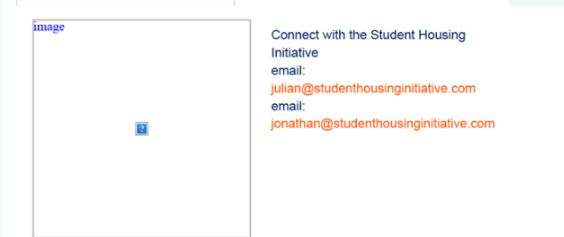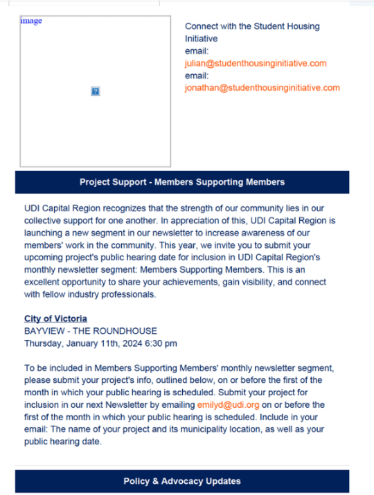 The email provided below the text julian@studenthousinginitiative.com is the same email the UDI advertised to its corporate members for support for their projects, underneath the contact for the UVic Real Estate Club.