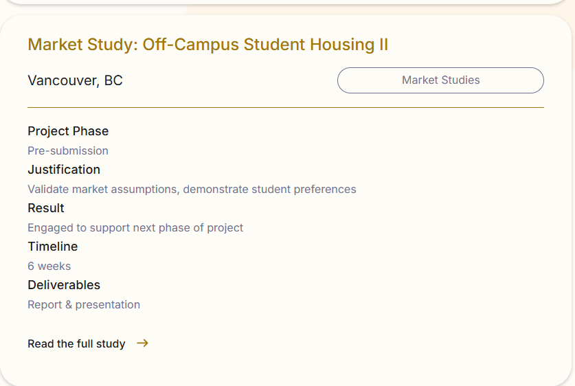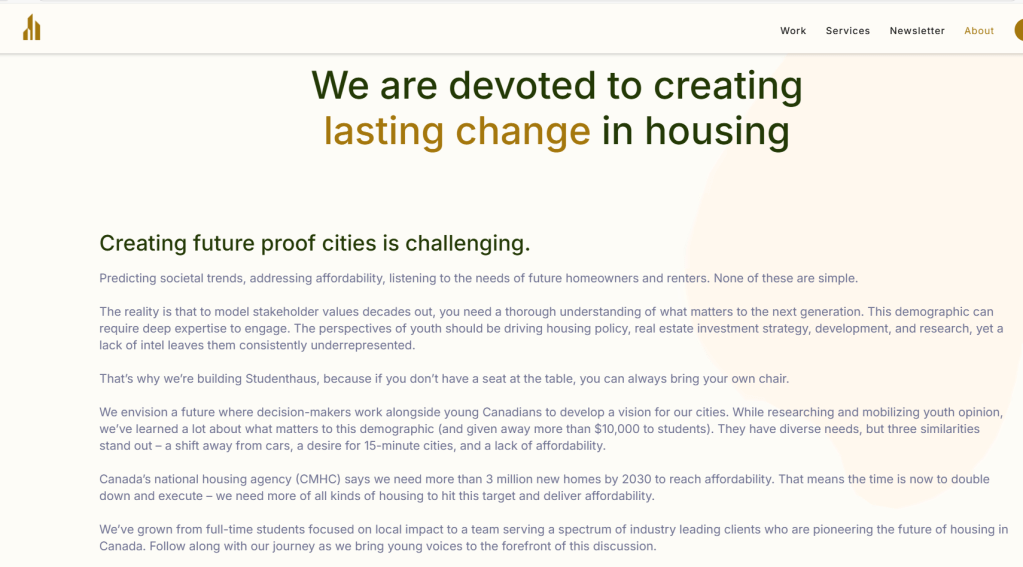 We’ve grown from full-time students focused on local impact to a team serving a spectrum of industry leading clients who are pioneering the future of housing in Canada. Follow along with our journey as we bring young voices to the forefront of this discussion.”