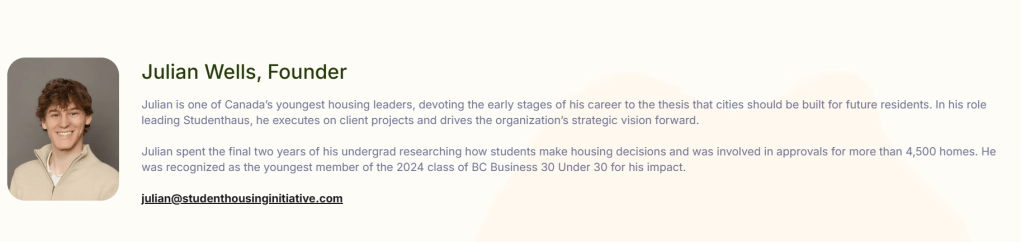 “Julian is one of Canada’s youngest housing leaders, devoting the early stages of his career to the thesis that cities should be built for future residents. In his role leading Studenthaus, he executes on client projects and drives the organization’s strategic vision forward.