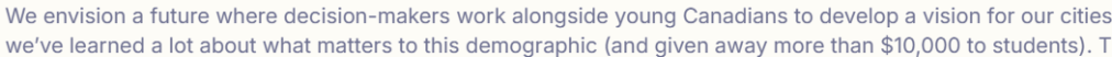 We envision a future where decision-makers work alongside young Canadians to develop a vision for our cities. While researching and mobilizing youth opinion, we’ve learned a lot about what matters to this demographic (and given away more than $10,000 to students).”