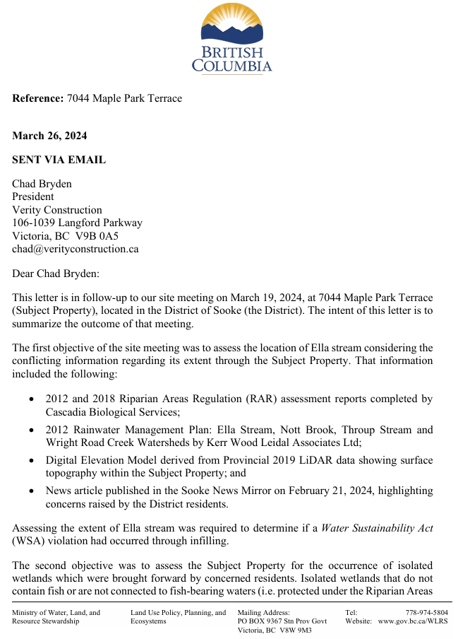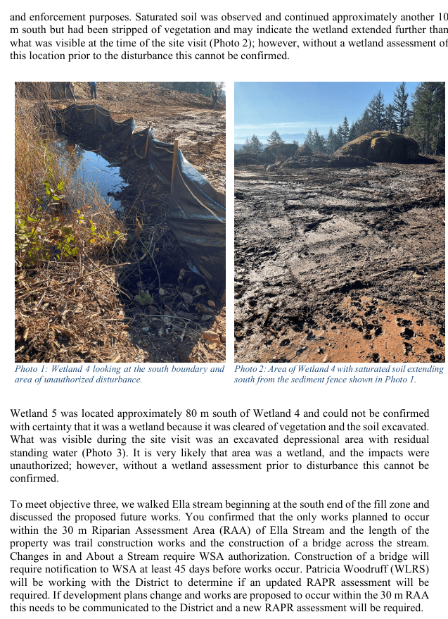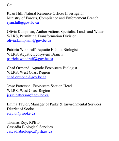 The following document attached to this email contains documentation of major environmental damage to the Ella Stream and around it, to which I have been informed by a Sooke local (who is afraid of speaking out himself), that this may have been a federal crime.